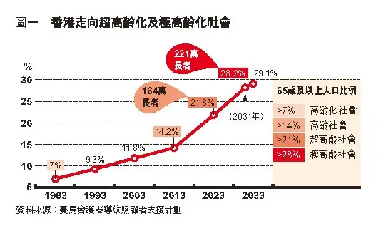 另一邊廂,香港養老需求旺盛。香港當下已邁入超高齡社會──目前近164 萬人口為65 歲或以上,佔全港人數21.8%〔圖一〕,預計在2046 年攀升至三分之一,變成極高齡社會,成為全球老齡化最嚴重的城市,養老慢慢成為香港社會共同話題。在擔心積蓄不足、醫療開支龐大及通脹蠶食退休金的經濟誘因驅使下,生活指數、人力成本低香港一截的大灣區無疑在長者們考慮之列。