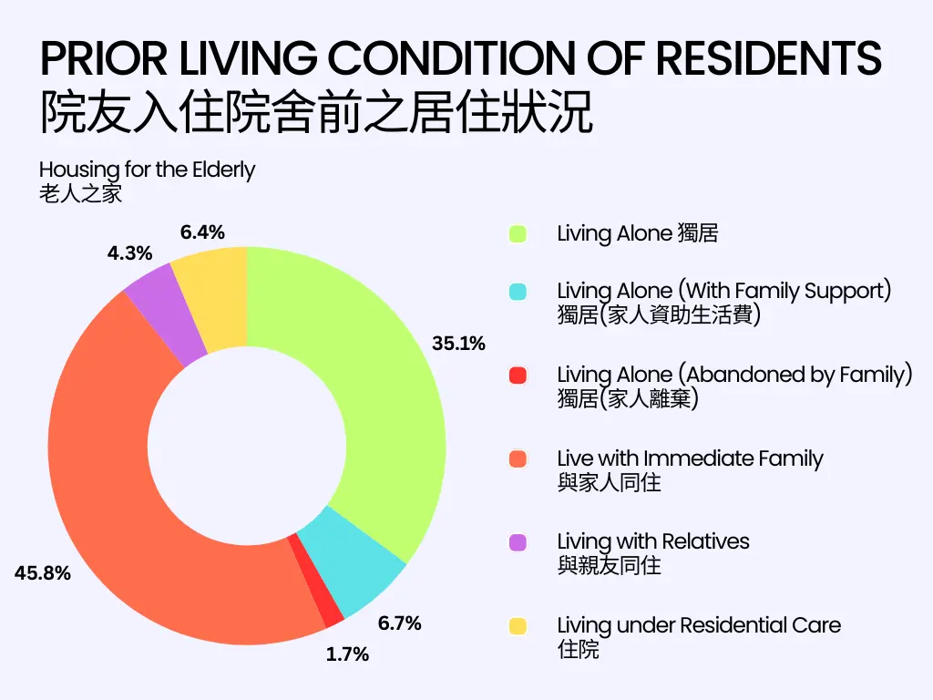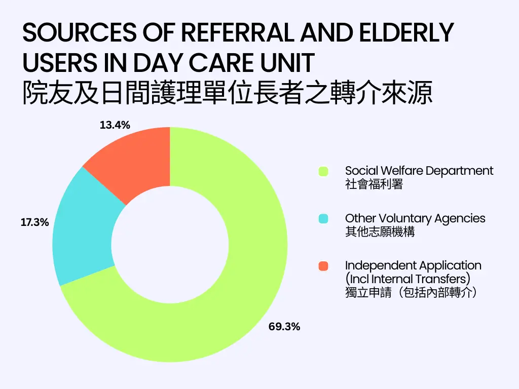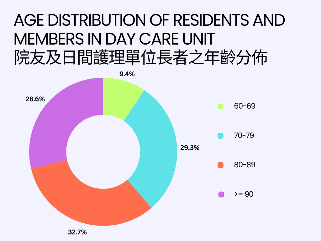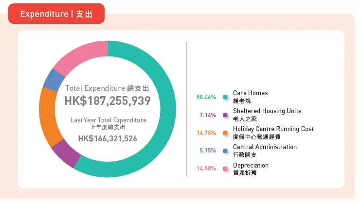 我们的经费主要用于支持护老院(58.46%),确保长者获得优质的照顾和服务。此外,经费的一部分用于假期中心的运营(14.75%)及资产折旧(14.50%),保障设施的正常运作和更新。行政开支占5.15%,确保机构的顺利管理,而7.14%的经费则用于老人之家等庇护服务,为有需要的长者提供安全居所。总体经费运用透明,致力于提升长者生活质素。